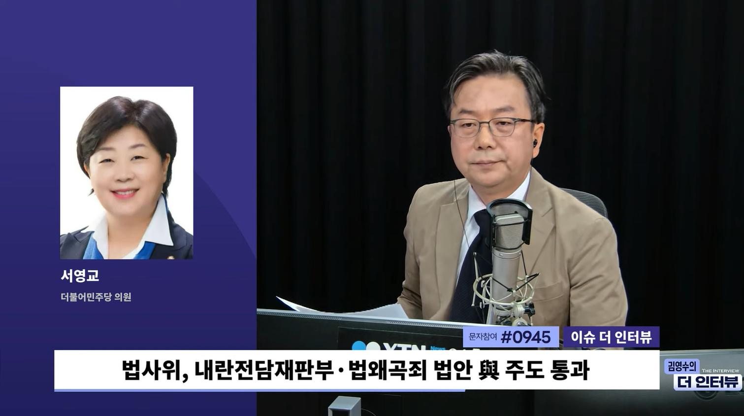 ◆ 김영수 : 라디오 <김영수의 더인터뷰> 1부 이슈 인터뷰 문을 열어주실 분 법사위 위원이시죠? 더불어민주당 서영교 의원입니다. 19대부터 22대까지 서울 중랑갑에서 내리 4선을 한 국회의원입니다. 여러 이슈 물어보겠습니다. 의원님 나와 계시죠?