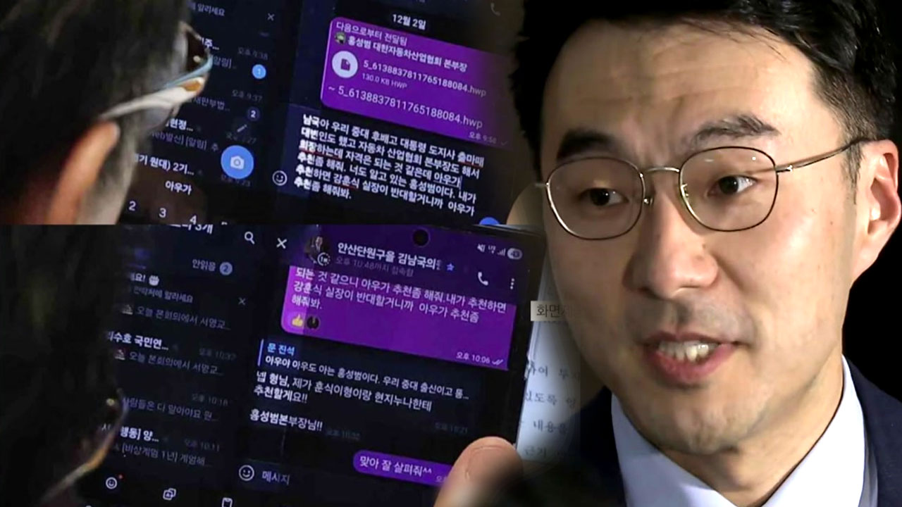 문 의원이 국회 본회의 도중 김 비서관에게 휴대전화 문자 메시지로, 같은 대학 출신 모 인사를 한국자동차산업협회장에 추천해달라고 한 게 언론사 카메라에 찍힌 겁니다.