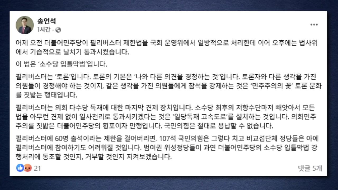 송 원내대표는 어제(4일) SNS에 글을 올려, 민주당이 어제 오전 운영위에 이어 오후엔 법사위에서 필리버스터 제한법을 날치기 통과시켰다며 이같이 적었습니다.