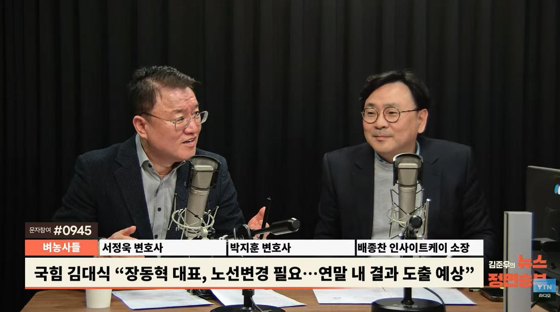 ■서정욱: 아니 그걸 지도부가 굳건한데 어떻게 끌어내리냐고요. 거기에 김재원, 김민수 신동욱 3명이 굳건하잖아요. 근데 어떻게 지도부가 5명이 사퇴도 안 되고 찰떡궁합이에요. 그러니까 제 말은 이게 대안도 없고 그래서 이게 장성철이나 좀 이렇게 참칭 보수 패널들이 자꾸 뭐 비대위가 어쩌고저쩌고 누가 TK 지역에 누가 어쩌고저쩌고 그거 아무 근거 없는 이야기예요. 저거 몇십 명 의원들 다 이렇게 물어봤는데 전부 다 이구동성으로 ‘대안이 있냐’ 장동혁 말고 누가 있냐 그리고 지도부도 굳건합니다.