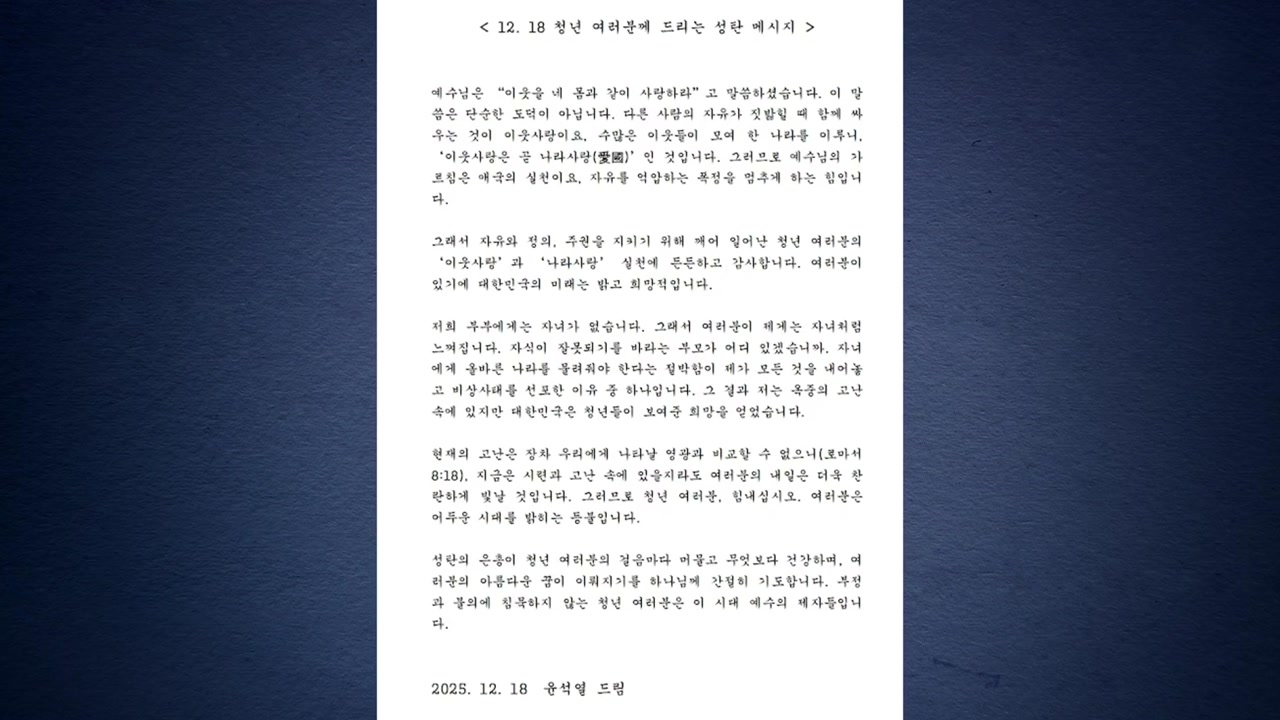 '자녀와도 같은 청년들에게 좋은 나라를 물려주기 위해 계엄을 했다'는 옥중 성탄 메시지를 냈는데요.