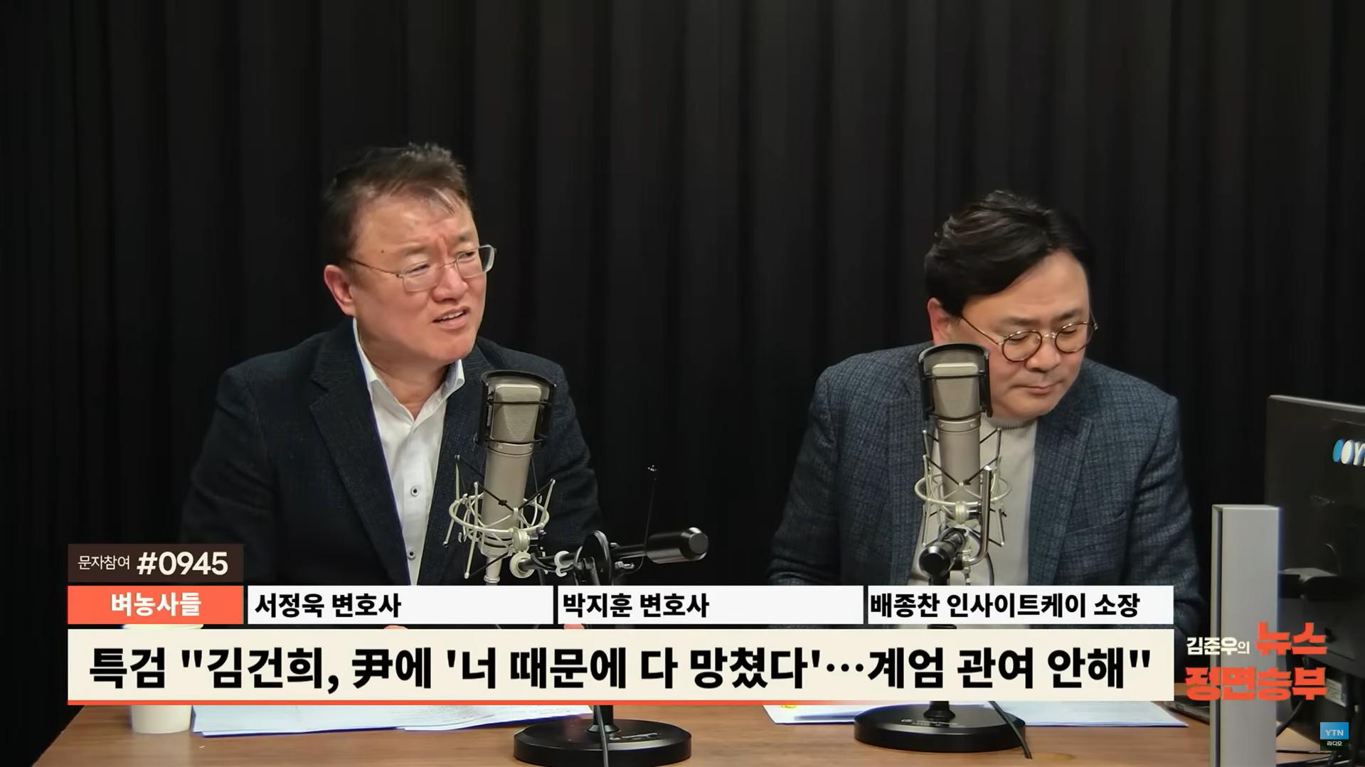 ☆ 서정욱 : 일단은 이게 특검이 남의 부부 싸움 규명하는 게 특검이 할 일입니까?정말 이게 저는 쪼잔하다 이런 생각이 들고요. 제가 이제 뭐 가족이나 또 변호인들 이렇게 물어보니 이게 전혀 사실이 아니다.현재 김건희 여사도 윤 대통령의 입장이 똑같아요. 계엄은 정당했다 이렇게 우리 이번에 윤석열 대통령이 생일을 맞이해 가지고 청년 세대를 위해서 내가 계엄했다 이러잖아요. 따라서 김건희 여사도 계엄에 대해서 뭐 비판적이거나 후회하거나 이게 아니다 그러니까 입장이 똑같다 이런 걸 제가 확인했고요.