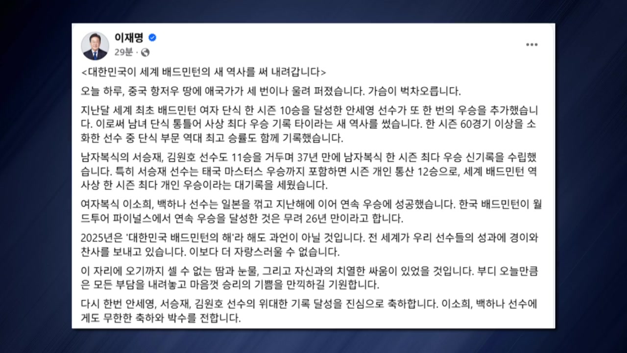 이재명 대통령이 세계 배드민턴 월드투어 파이널스에서 우승한 우리 선수들을 축하했습니다.