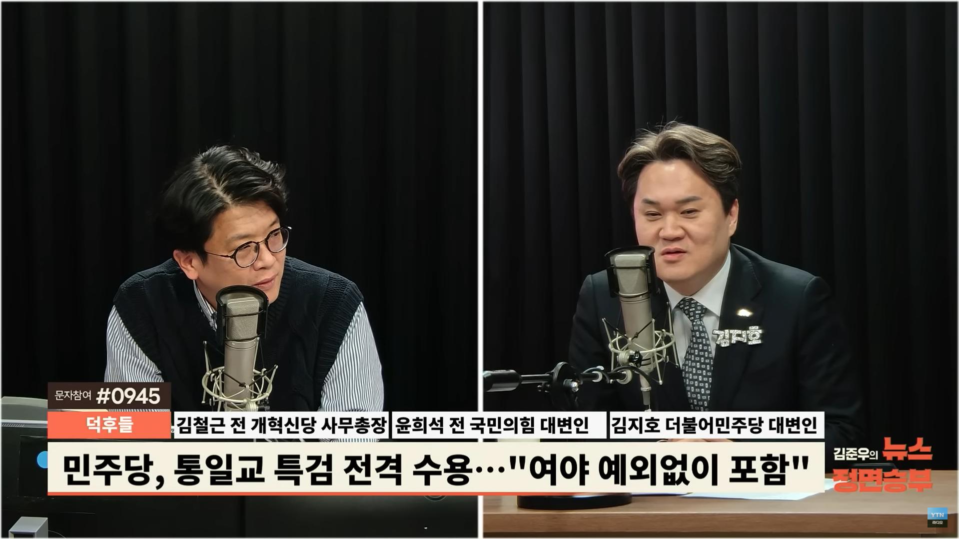 ★ 김지호 : 일단은 뭐 대통령실하고 어제 당정 협의에서 협의한 내용은 아니지만 당에서 어떤 이러한 정책을 추진하는 거에 있어서 협의를 한 것 같습니다. 전달을 한 것 같고 이것은 그냥 저의 생각인데요. 일단 저희가 뭐 예를 들어서 통일교에서 저희 정치인들의 책을 한 500권 사줬다면 그냥 저희 생각으로는 국민의힘은 한 2만 권 정도 사주지 않았을까. 이런 예를 들면 뭐 그런 판매량이 달랐다 판매량이 훨씬 더 저쪽이 많이 사줬다는 생각도 들고 그리고 이제 좀 그런 부분도 있어요. 저희가 2017년 대선 경선 그리고 2021년 대선 경선 이때 보면요.오픈프라이머리를 하면 꼭 이상한 표들이 막판에 몇만 표씩 들어와요. 저희는 사실은 그 부분 관련해서는 굉장히 이상한 흐름인데 뭐 수사가 진행이 안 되다 보니까 못 밝혀졌거든요. 그래서 2025년 민주당 대선에서는 오픈 프라이머리가 폐지됐습니다. 여론조사로 대체했어요.