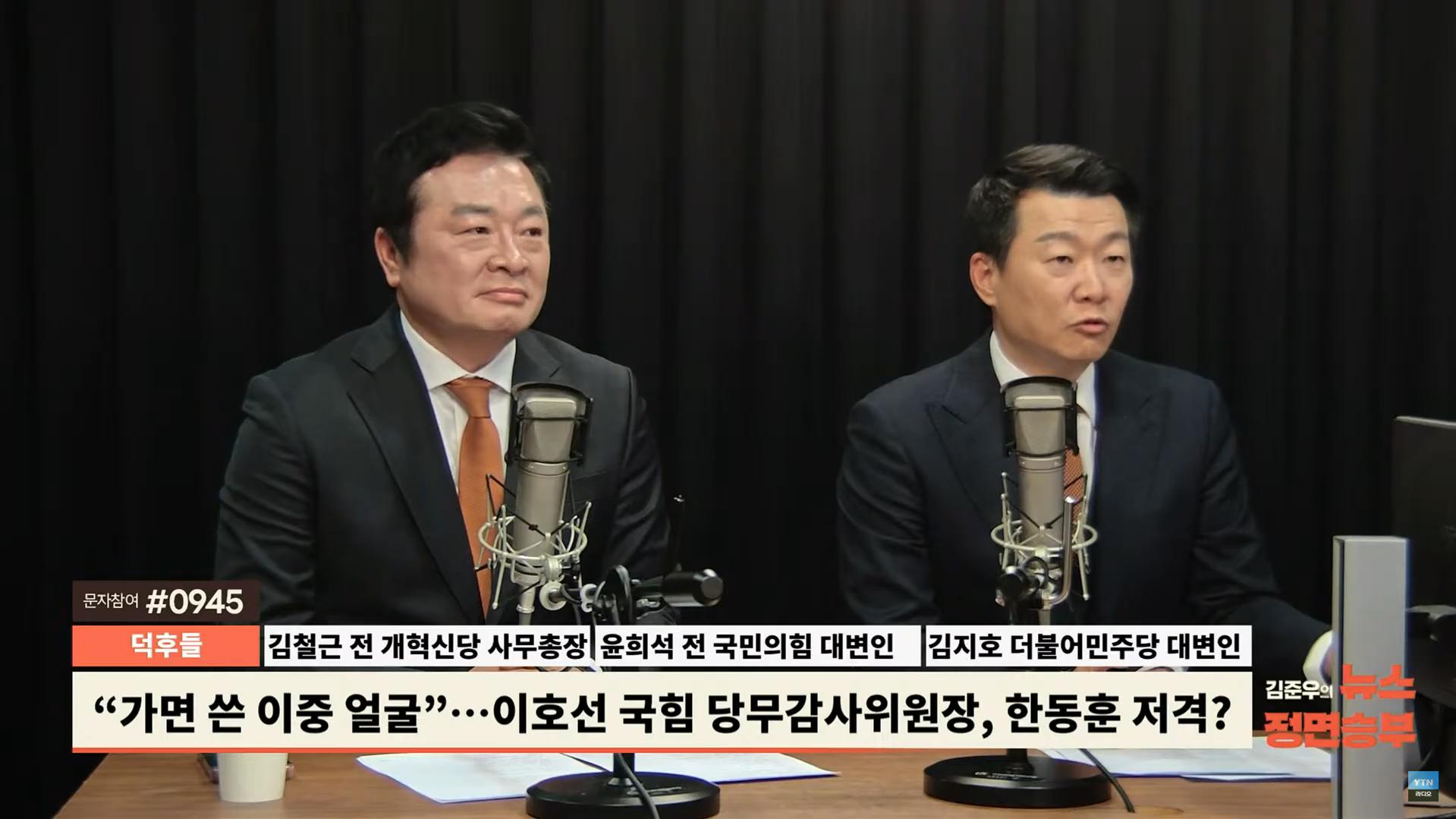 ☆ 윤희석 : 제가 이거 한마디만 말씀드릴게요. 지금 이호선 위원장이 글 올린 게 책 군중과 권력 그 일부를 인용한 건데요. 이걸 왜 한동훈 전 대표를 겨냥한 것이라고 단정 짓는지 모르겠어요. 내용을 보면 그가 가면을 자주 쓰면 쓸수록 가면에 대해 알면 알수록 더 가면의 실상 속으로 흘러들어간다. 변신은 상당한 정도까지 가능하지만 완전할 수 없다. 가면은 벗겨질 수 있고 가면 착용자는 그걸 두려워해야 하기 때문이다. 저는 다른 사람이 떠오르는데 저는 그렇기 때문에 이걸 한동훈 전 대표를 겨냥한 거라고 보기에는 굉장히 어렵고 이 가면 누가 쓰고 있는 건가에 대해서 당원들의 판단은 다 끝났다고 봅니다. 그런데 이 가면 쓴 사람의 가면 때문에 못 간다는 거 아니에요? 본인도 이 길이 잘못된 건 알지만 갈 수밖에 없는 슬픈 눈을 하고 있다고 저는 생각을 해요. 그런 차원에서 저희 당의 변화를 기대해 보는 것도 괜찮다, 이 시점에서는.