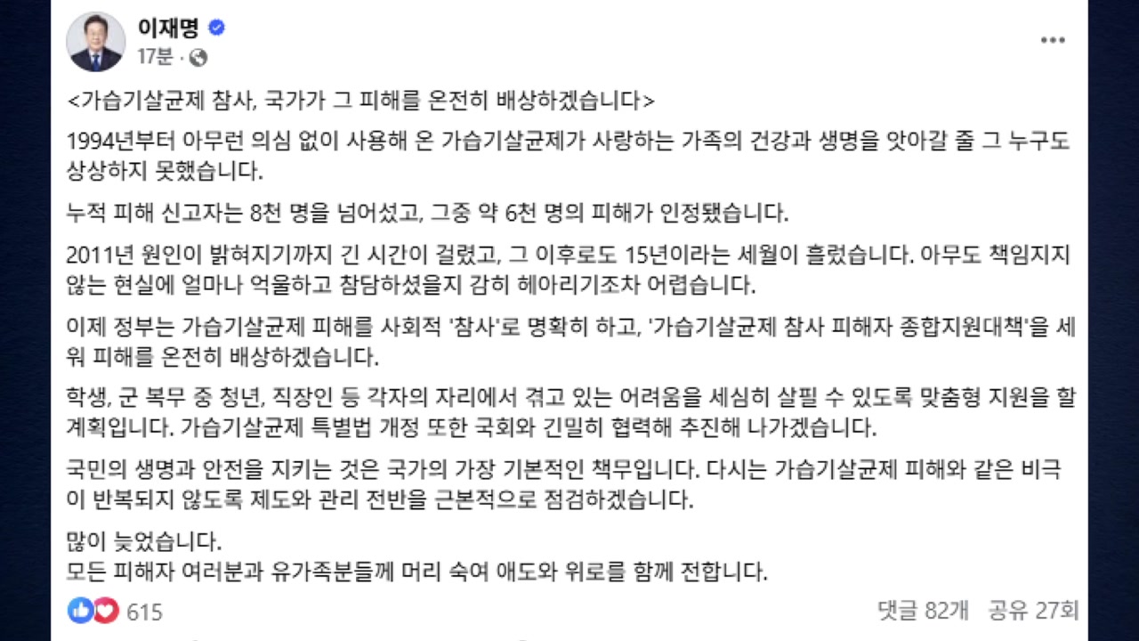 이 대통령은 오늘(24일) SNS에, 가습기 살균제 누적 피해 신고자는 8천 명을 넘어섰고, 그중 약 6천 명의 피해가 인정됐다며 이같이 적었습니다.