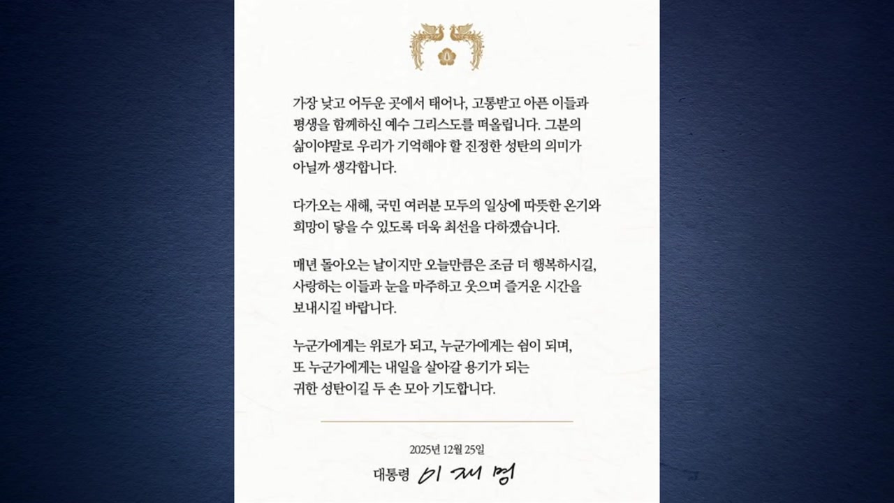 이 대통령은 오늘(25일) 성탄절을 맞아 매년 돌아오는 날이지만 오늘만큼은 조금 더 행복하고, 사랑하는 이들과 눈을 마주하고 웃으며 즐거운 시간을 보내시길 바란다며 이같이 적었습니다.