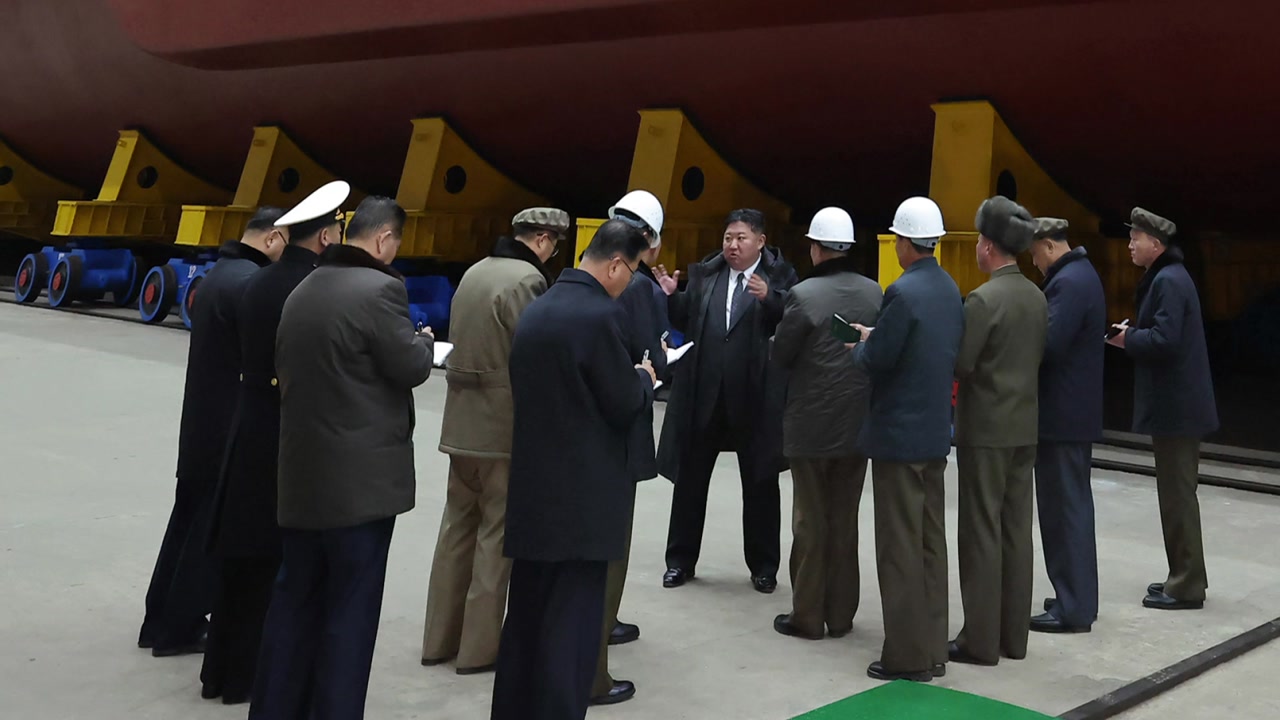 김정은 북한 국무위원장이 딸 주애와 함께 군 간부들의 설명을 들으며 잠수함 건조 현장을 둘러보고 있습니다.