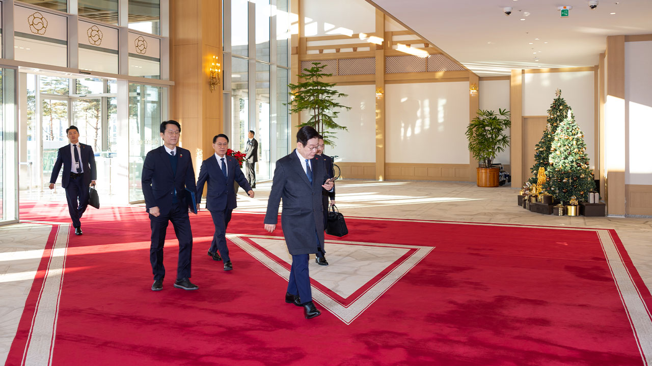 대통령실은 수행원들과 함께 오늘 오전 용산 대통령실로 들어서는 이 대통령의 사진을 이례적으로 언론에 공개했습니다.