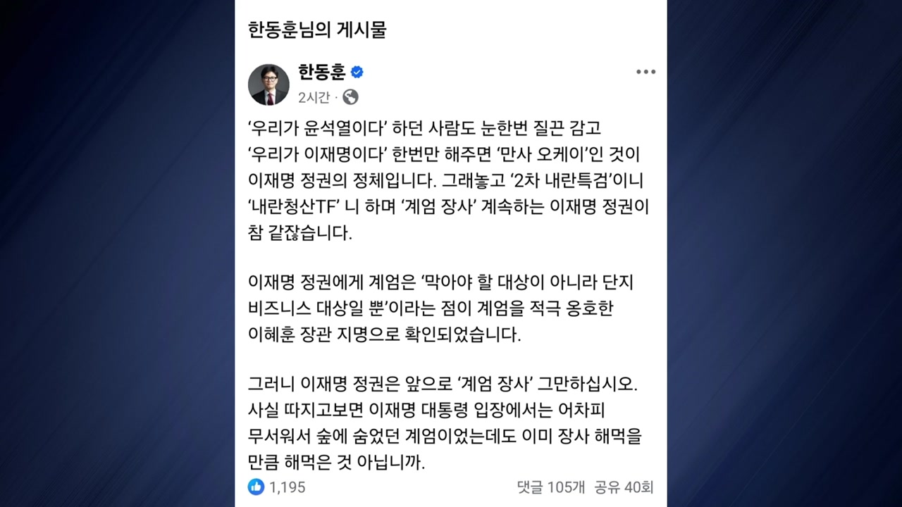 한 전 대표는 SNS 게시글을 통해 이 전 의원의 장관 지명으로, 이재명 정권에 계엄은 막아야 할 대상이 아닌 비즈니스 대상일 뿐이란 점이 확인됐다고 비판했습니다.