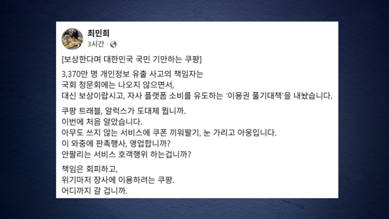 최 의원은 오늘(29일) SNS에 개인정보 유출 사고의 최고 책임자는 국회 청문회에 나오지 않으면서 쿠팡이 보상이랍시고 자사 플랫폼 소비를 유도하는 쿠폰 이용권을 내놓았다며 이같이 적었습니다.