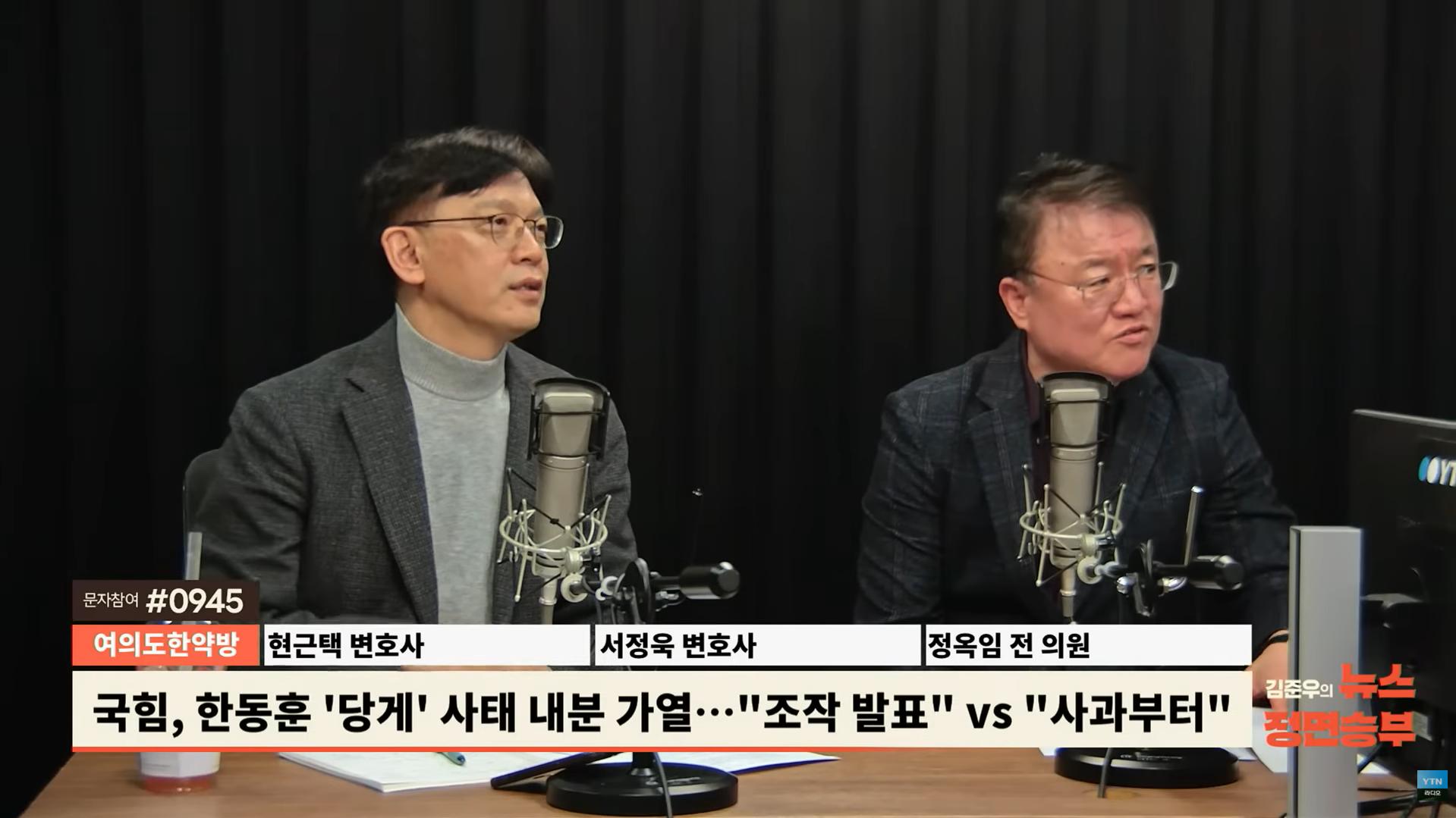◇ 김준우 : 여의도 한약방 서정욱, 현근택 변호사 그리고 정옥임 전 의원과 함께 하고 있습니다. 어제 국민의힘의 당무 감사위원회에서 게시판 관련해서 최종 결과를 발표를 했는데, 올라왔던 글들을 다 모아가지고 이호선 교수 블로그에 올라와 있더라고요. 더더욱 강경 모드로 가는 느낌인데 ,한동훈 대표는 어제 다른 방송에 나와서 처음으로 이에 관한 유감이나 사과 입장을 표명을 했습니다. 그럼에도 불구하고 이것은 결국 징계 수순으로 가는 거 아니냐고 하는데, 과연 장동혁 대표가 어떤 선택을 할지 굉장히 궁금하고요. 다른 한편으로는 한동훈 대표 혹은 한동훈 측에서는 ‘동명의인 한동훈이 쓴 게시물까지 몰아세운 것은 과도하다’ 이런 반발도 하고 있는데요. 이 사태 어떻게 흘러갈 거라고 전망하시는지요?