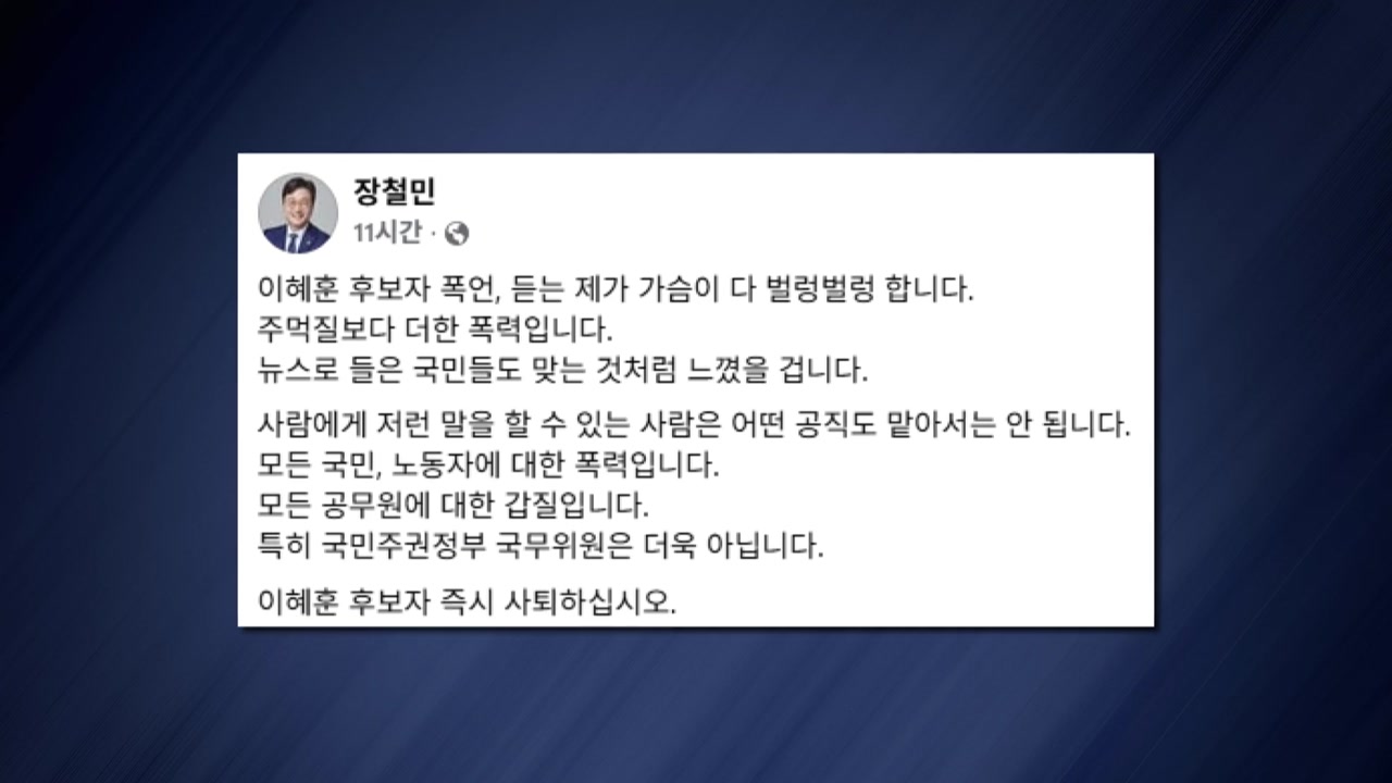 비명계로 분류되는 재선 장철민 의원은 SNS에 이 후보자가 과거 보좌직원에게 폭언한 보도를 언급하며 주먹질보다 더한 폭력이며, 뉴스를 들은 국민도 맞는 것처럼 느꼈을 거라고 적었습니다.