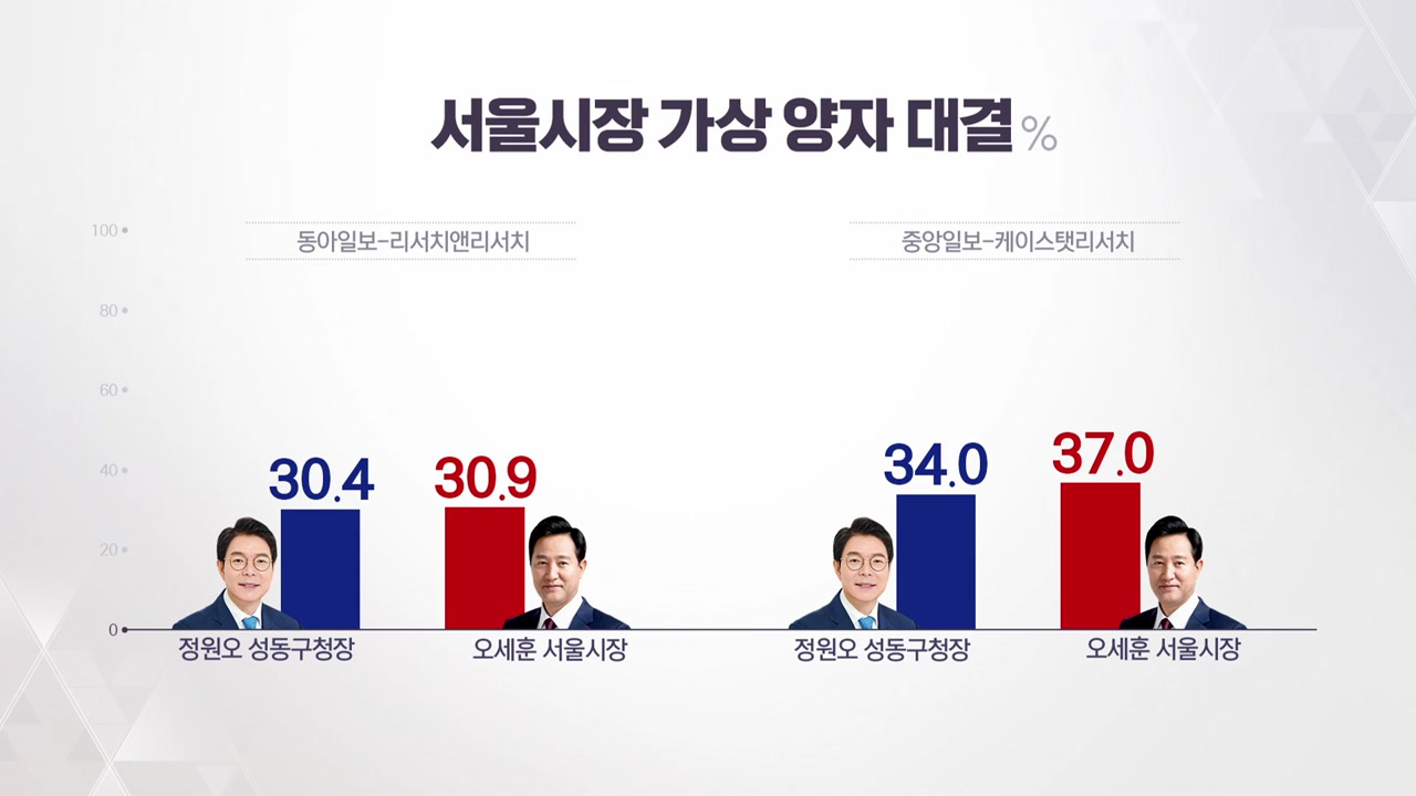 서울시장 가상 양자대결에서 현역 오세훈 시장과 신예인 정원오 성동구청장 박빙이죠.