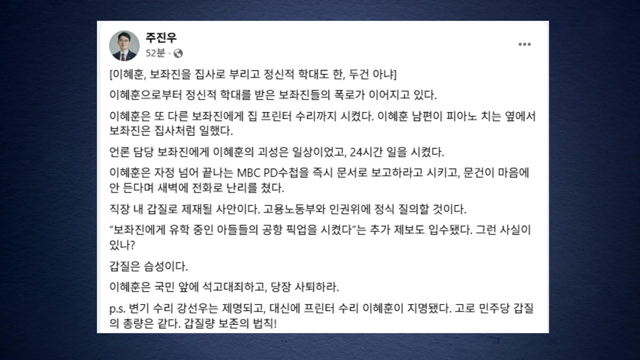 주 의원은 '변기 수리' 강선우 의원은 제명됐고 대신 '프린터 수리' 이 후보자가 지명됐다며, 민주당 갑질의 총량은 같은 '갑질량 보존의 법칙'이라고 비꼬았습니다.