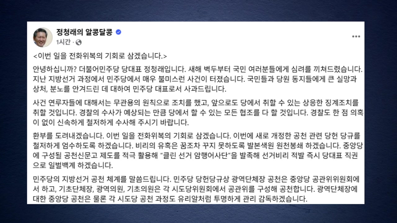 정 대표는 오늘(3일) SNS에 민주당에서 매우 불미스런 사건이 터졌다며, 큰 실망과 상처, 분노를 안겨드린 데 대해 민주당 대표로서 사과드린다고 이같이 적었습니다.