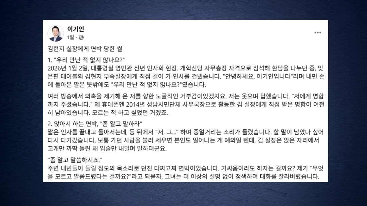 개혁신당 이기인 사무총장은 청와대 영빈관 신년인사회에서 김현지 청와대 부속실장에 면박을 들었다며 사과를 요구했습니다.
