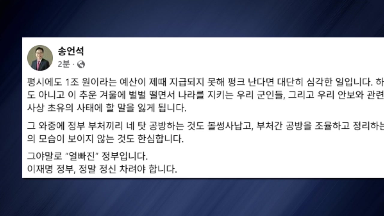 국민의힘 송언석 원내대표가 지난 연말까지 군과 방위사업체에 지급됐어야 할 국방비 1조 3천억 원이 제때 지급되지 못한 것과 관련해 그야말로 얼빠진 정부라며 정신 차려야 한다고 비판했습니다.