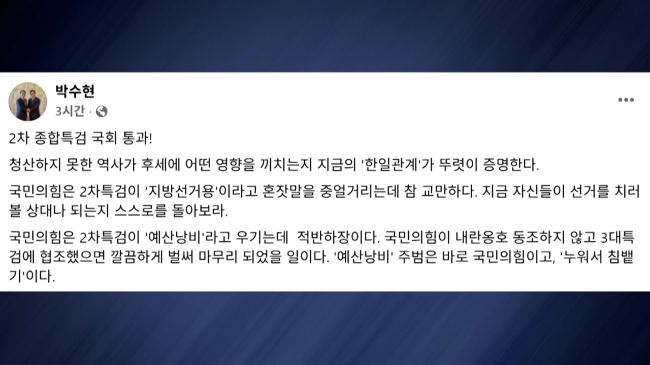 그러면서, 국민의힘이 내란옹호에 동조하지 않고 3대 특검에 협조했으면 벌써 깔끔하게 마무리가 됐을 거라며 예산 낭비의 주범은 바로 국민의힘이라고 지적했습니다.