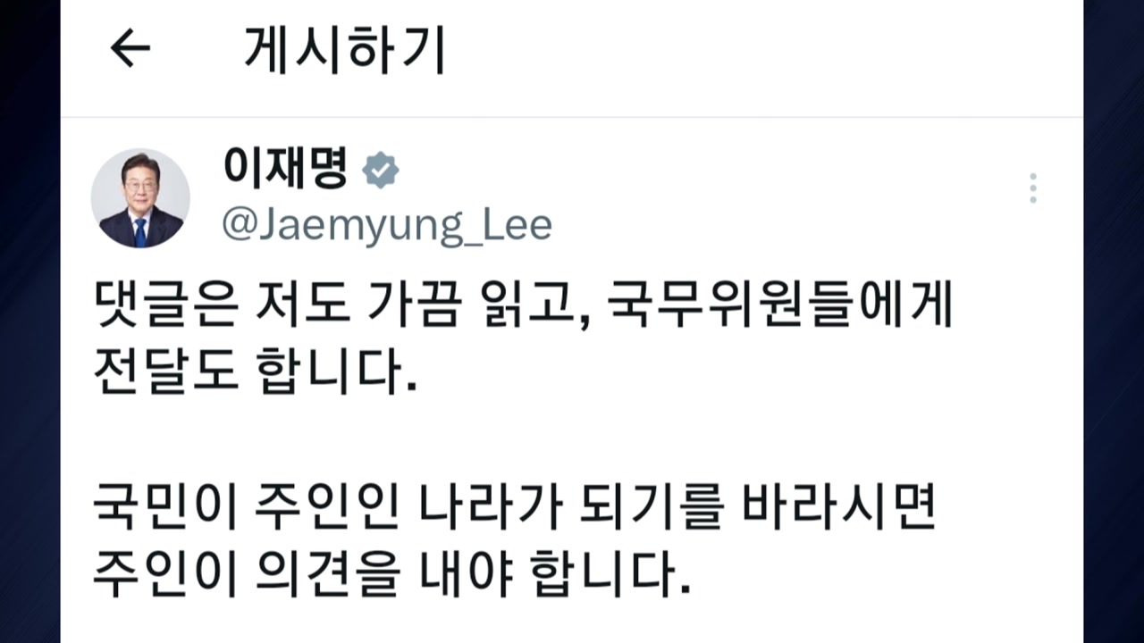 이 대통령은 오늘(18일) 자신의 SNS에 한 누리꾼이 올린 글을 공유하며, "댓글은 저도 가끔 읽고 국무위원들에게 전달도 한다"고 적었습니다.