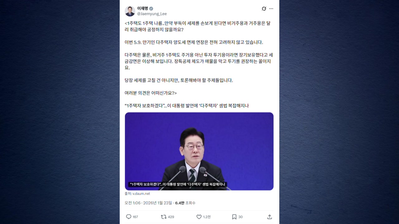 이 대통령은 오늘(23일) SNS에, ’다주택자들이 세제 개편 가능성에 셈법이 복잡해지고 있다’는 취지의 언론 보도를 공유하며, 이같이 적었습니다.