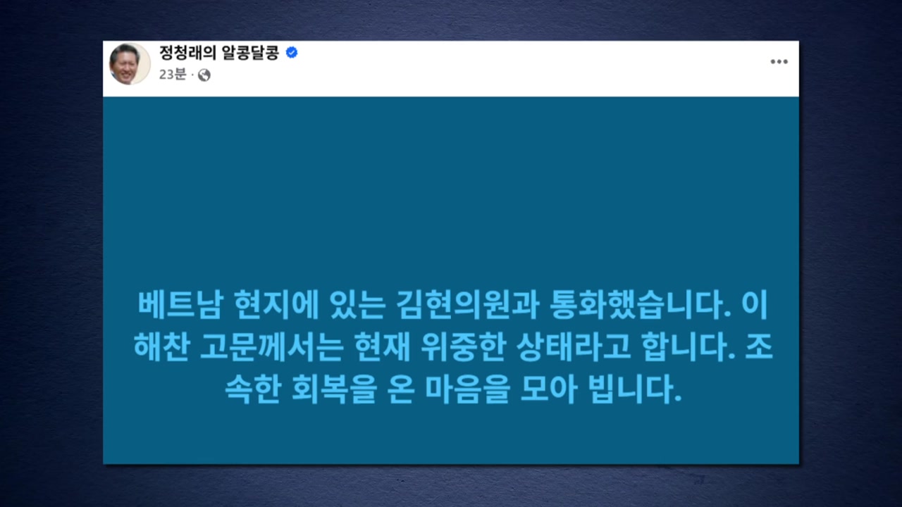 정 대표는 오늘(24일) SNS에 올린 글에서 베트남 현지에 있는 김현 의원과 통화했다며 이같이 적었습니다.