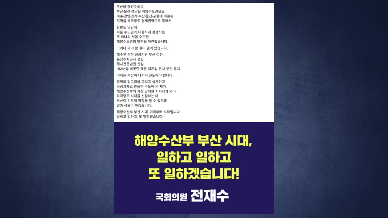 이어 당장은 부산 유일 집권여당 국회의원으로서 해양수산부 부산 시대를 여는 데 필요한 역할에 집중하겠다고 덧붙였습니다.