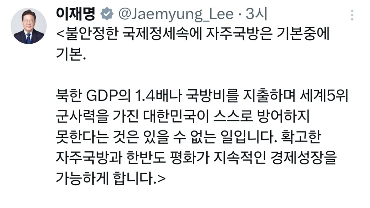 이어 북한 GDP의 1.4 배를 국방비로 지출하고, 세계 5위 군사력을 가진 대한민국이 스스로 방어하지 못한단 건 있을 수 없는 일이라며, 확고한 자주국방과 한반도 평화가 지속적인 경제 성장을 가능하게 한다고 강조했습니다.