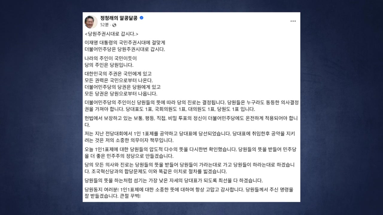 정 대표는 어제(24일) SNS에 1인 1표 제에 대한 당원들의 압도적 다수의 뜻을 다시 한 번 확인했다며, 민주당을 더 좋은 민주주의 정당으로 만들겠다고 강조했습니다.
