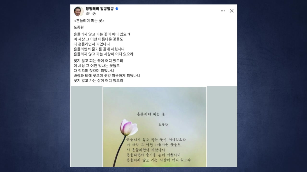 정 대표는 이에 앞서서도 SNS에 "흔들리지 않고 피는 꽃이 어디 있으랴"로 시작하는 도종환 시인의 시 한 편을 올렸습니다.