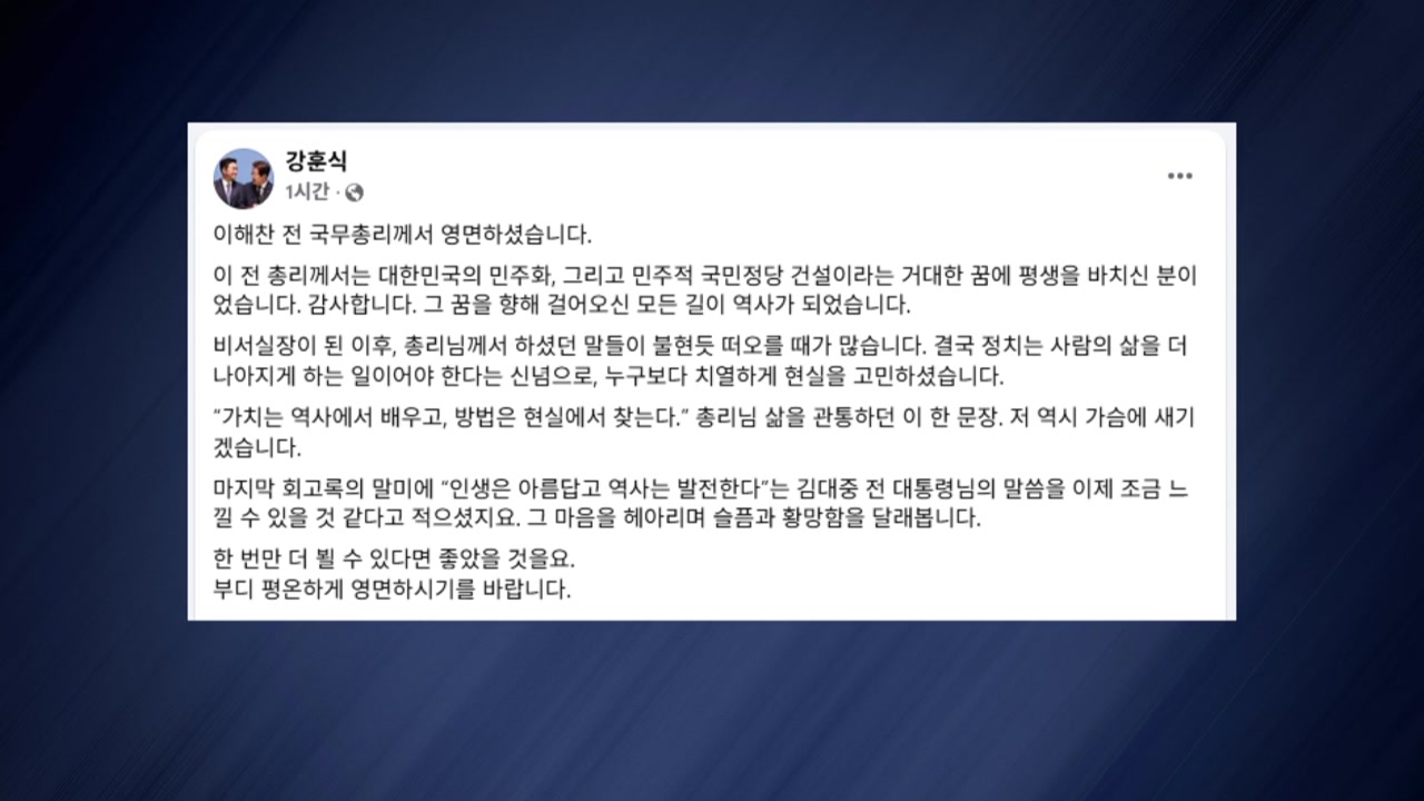 강훈식 대통령비서실장은 이해찬 민주평화통일자문회의 수석부의장이 대한민국의 민주화, 민주적 국민정당 건설이라는 거대한 꿈에 평생을 바친 분이었다고 추모했습니다.