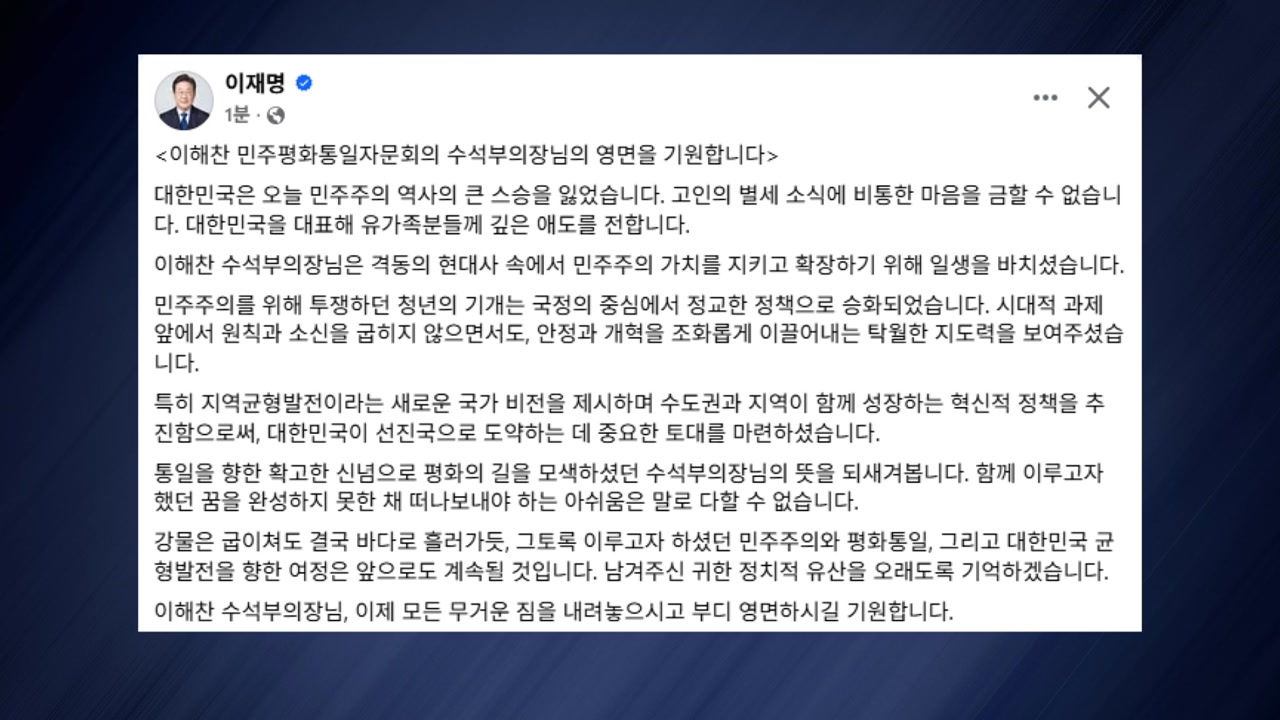 ![[속보] 이 대통령, 이해찬 별세에 "민주주의 역사 큰 스승 잃어"](https://image.ytn.co.kr/general/jpg/2026/0125/202601252052421780_t.jpg)