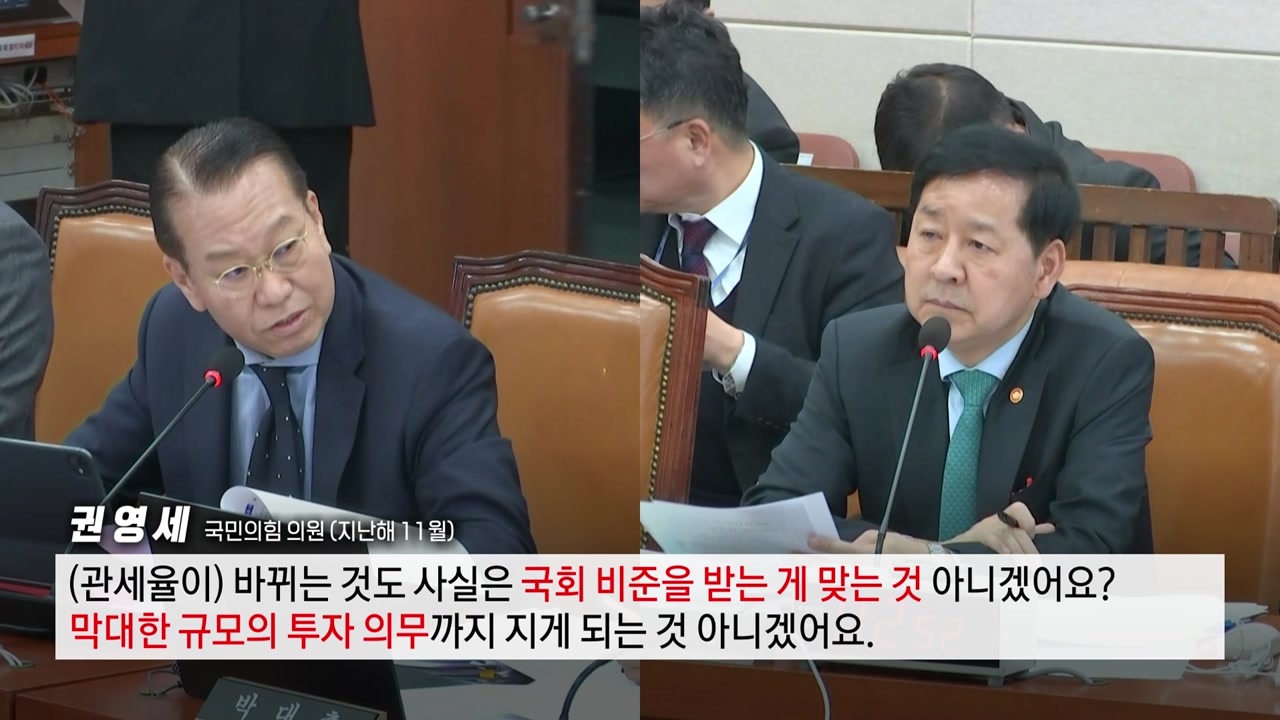 [권영세 / 국민의힘 의원 (지난해 11월) : 한미 FTA가 유효하다고 얘기를 하셨지요. 그렇지요? (예) FTA도 국회 비준 받았으니까 (관세율이) 바뀌는 것도 사실은 <국회 비준을 받는 게 맞는 것> 아니겠어요? <막대한 규모의 투자 의무>까지 지게 되는 것 아니겠어요.]