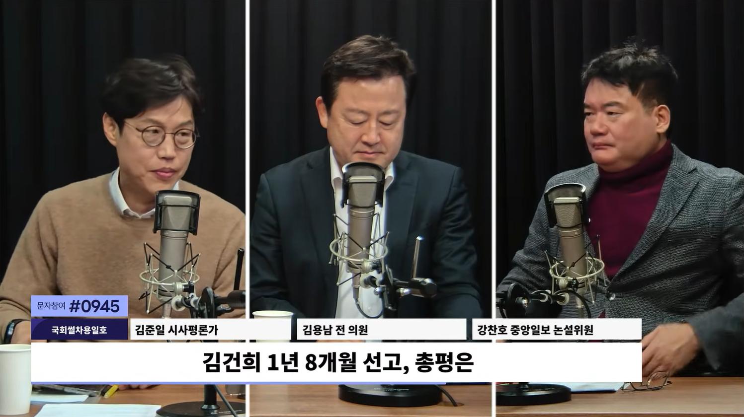 ◆ 김영수 : <용일호>가 돌아왔습니다. 김준일 평론가, 김용남 의원님, 강찬호 의원님까지. 어서 오십시오. 오늘 이슈가 많습니다. 오늘 첫 이슈는 김건희 여사 징역 1년 8개월 선고에 대해서 이야기를 나눠보겠습니다. 특검의 구형량 징역 15년에 한참 못 미치는 판결이 나왔습니다. 1년 8개월 어떻게 보셨어요?