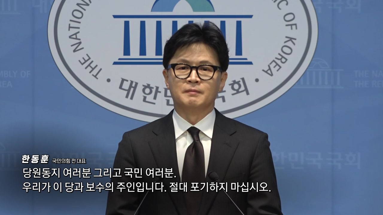 [한동훈 / 국민의힘 전 대표 : 오늘 저는 제명당했습니다. 저를 제명할 수는 있어도 국민을 위한 좋은 정치의 열망을 꺾을 수는 없습니다. 당원동지 여러분 그리고 국민 여러분. 우리가 이 당과 보수의 주인입니다. 절대 포기하지 마십시오. 기다려 주십시오. 저는 반드시 돌아옵니다.]