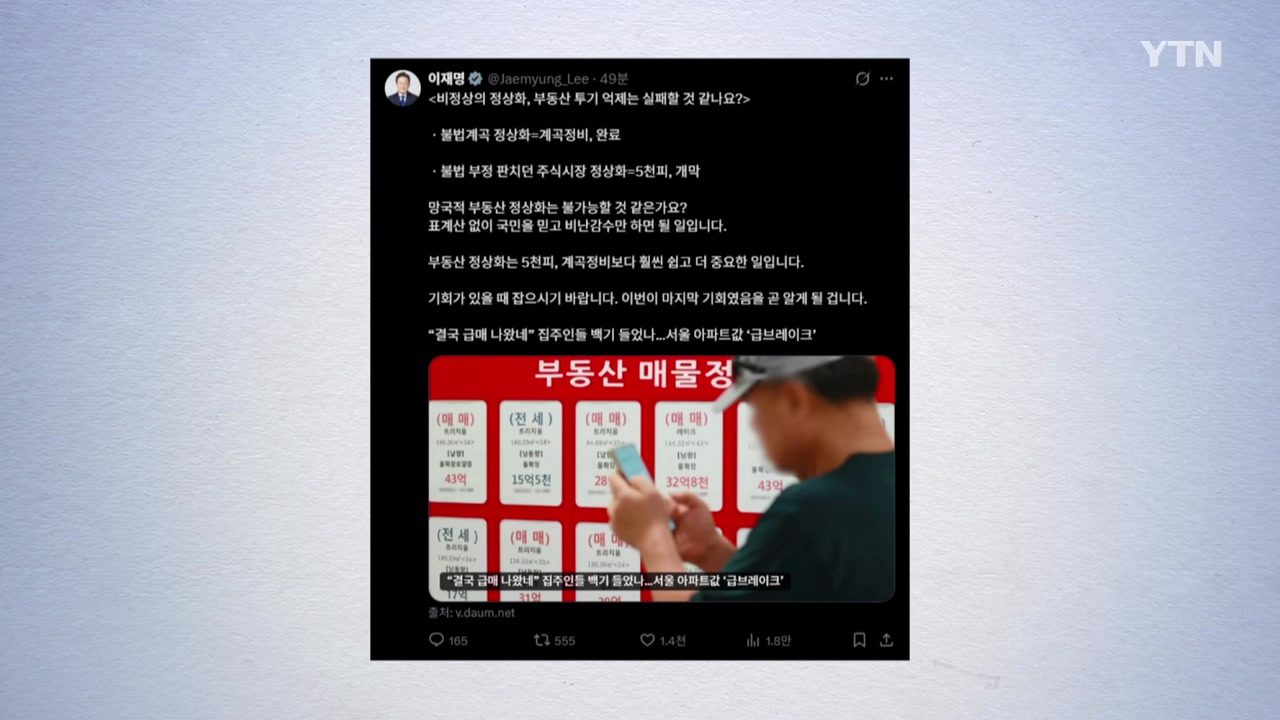 이 대통령은 오늘(31일) SNS에, 정부의 부동산 세제 개편 검토 이후 서울 아파트 거래가 줄고 일부 매도 물량이 등장했다는 기사를 공유하며 이같이 밝혔습니다.