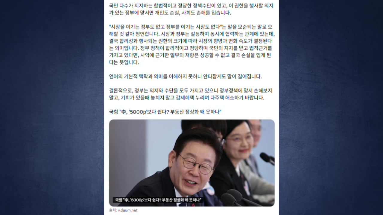 어제 ’부동산 정상화가 불가능할 것 같으냐, 계곡 정비나 코스피 5천 달성보다 훨씬 더 쉽고 중요하다’고 쓴 데 이어, 이를 부연 설명하는 내용을 재차 올린 겁니다.