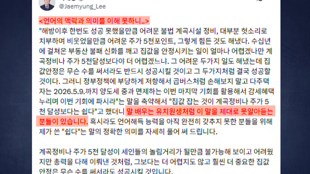 아시다시피 부동산 정상화를 강조했지 않습니까? 최근에 이 대통령이 공약을 했던 코스피 5000을 달성했지 않습니까? 그 자신감을 바탕으로 해서 앞으로 부동산 정상화 관련한 정책 드라이브를 걸겠다, 이런 의지로 풀이가 되는데요. 특히 다주택자 양도세 중과 유예 조치를 폐지하면서 일부 반발이 있겠지만 여론을 등에 업고 강력하게 추진하겠다는 의지를 거듭 강조한 것 같은데요. 이재명 대통령이 옛 트위터인 X에 올린글인데요. 망국적인 부동산 정상화 불가능할 것 같은가요, 표 계산 없이 국민을 믿고 비난감수만 하면될 일이다. 부동산 정상화는 코스피 5000P나 계곡 정비보다 훨씬 쉽고 더 중요한 일이다. 이렇게 얘기하지 않았습니까? 실제로 코스피 5000P보다 쉬운지는 모르겠지만 더 중요한 일인 것은 맞죠. 어차피 돈이라는 것이 부동산으로 쏠리는 것보다는 증시로 쏠리는 것이 훨씬 더 경제를 위해서는 좋은 일 아니겠습니까? 그래서 부동산 정상화를 계속 강조하는 것이고또 주택이라는 것은 우리 국민 생활에 반드시 필요한 의식주 가운데 하나 아니겠습니까? 그렇기 때문에 주택 가격 정상화는 굉장히 중요한 일이고 대통령이 이 부분에 신경을 쓸 수밖에 없는 그런 부분이라고 할 수 있겠죠. 여기서 이 대통령이 얘기한 계곡 정비라는 것은 이 대통령이 경기도지사 시절에 계곡하고 하천 불법 시설을 완전히 정비했던 그런 사업들을 말하는 건데요. 또 기회가 있을 때 잡으시길 바란다. 아까 얘기했듯이 5월 9일이면 양도세 중과 유예했던 그런 정책을 완전히 폐지한다는 것 아닙니까? 그럴 때 감세 혜택이 있을 때 감세 혜택을 누리면서 팔라는 얘기다, 이렇게 자세하게 설명을 하기도 했고요. 또 다주택자들이 앞으로 집값이 올라가거나 또는 양도세 중과유예가 다시 재개해야 되지 않겠나 하는 그런 기대감을 일부 가지고 안 팔 수도 있는데 이러한 부분을 확실하게 경고한 것이다, 이렇게 설명할 수 있겠습니다.