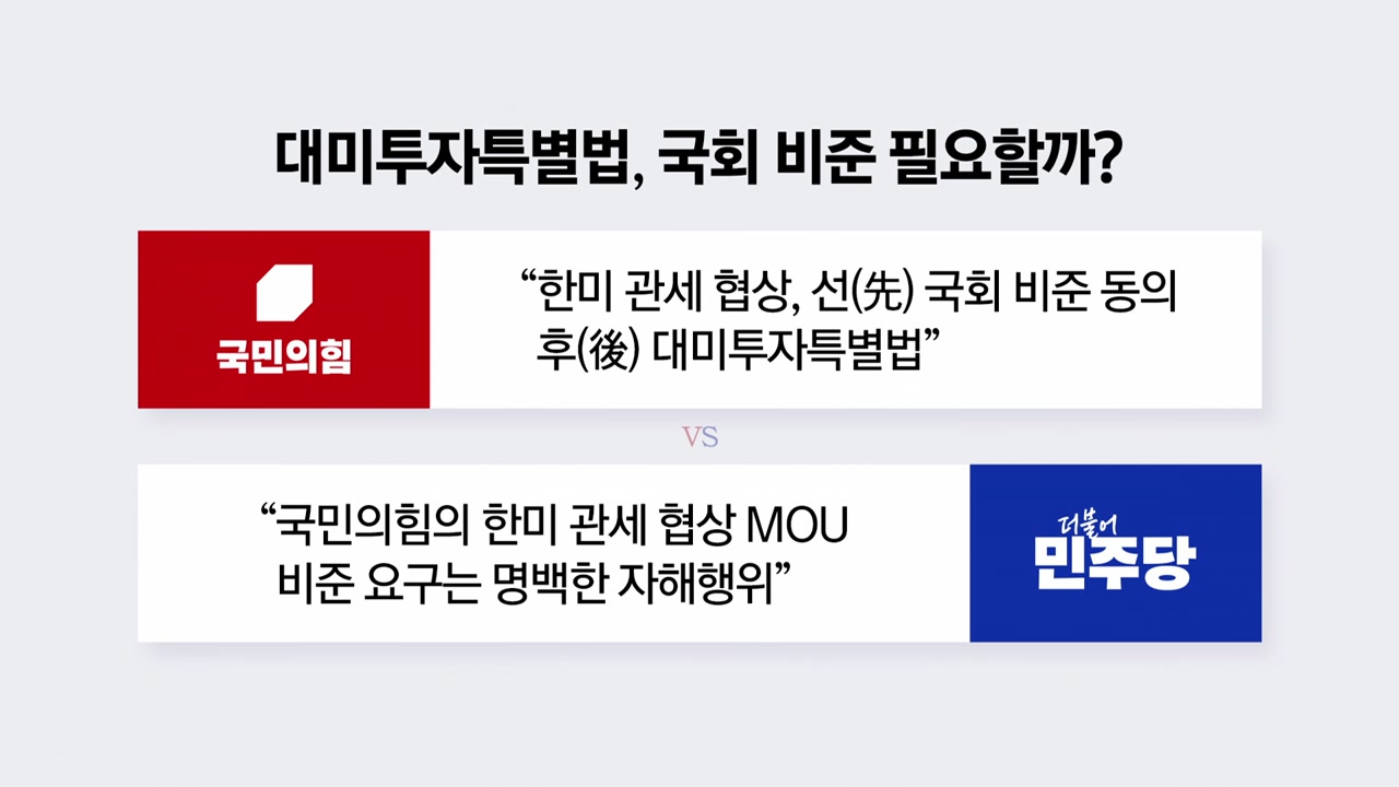이런 국민의힘의 비준 동의 주장에 대해서 민주당에서는 소모적이다. 국익을 오히려 훼손하고 있는 것이다, 이렇게 받고 있는 것인데 쟁점은 이런 것 같습니다. 대미투자 관련 양국의 협의사항을 양해각서로 볼 것이냐, 조약의 성격으로 볼 것이냐.