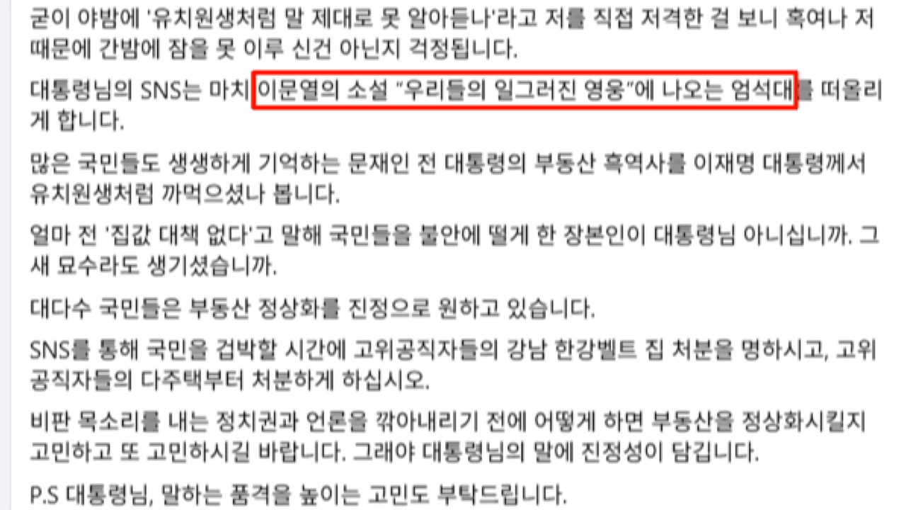 부동산 소유 자체가 범죄가 아닌데, 공포감을 조성해 ’단속 대상’으로 몰고 있다면서 소설 ’우리들의 일그러진 영웅’의 ’엄석대’에 비유하기도 했습니다.