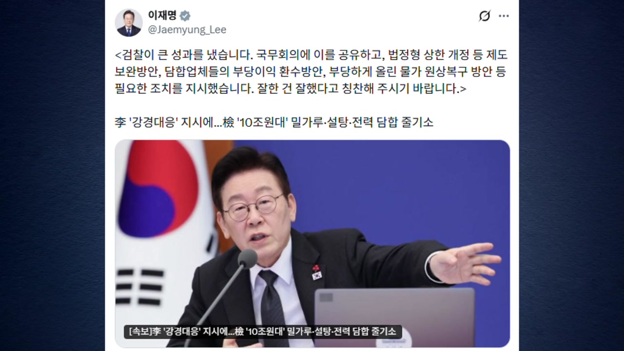 이재명 대통령은 검찰이 밀가루 등 여러 업체들의 짬짜미를 밝혀내 재판에 넘긴 데 대해, 큰 성과를 냈다고 칭찬했습니다.