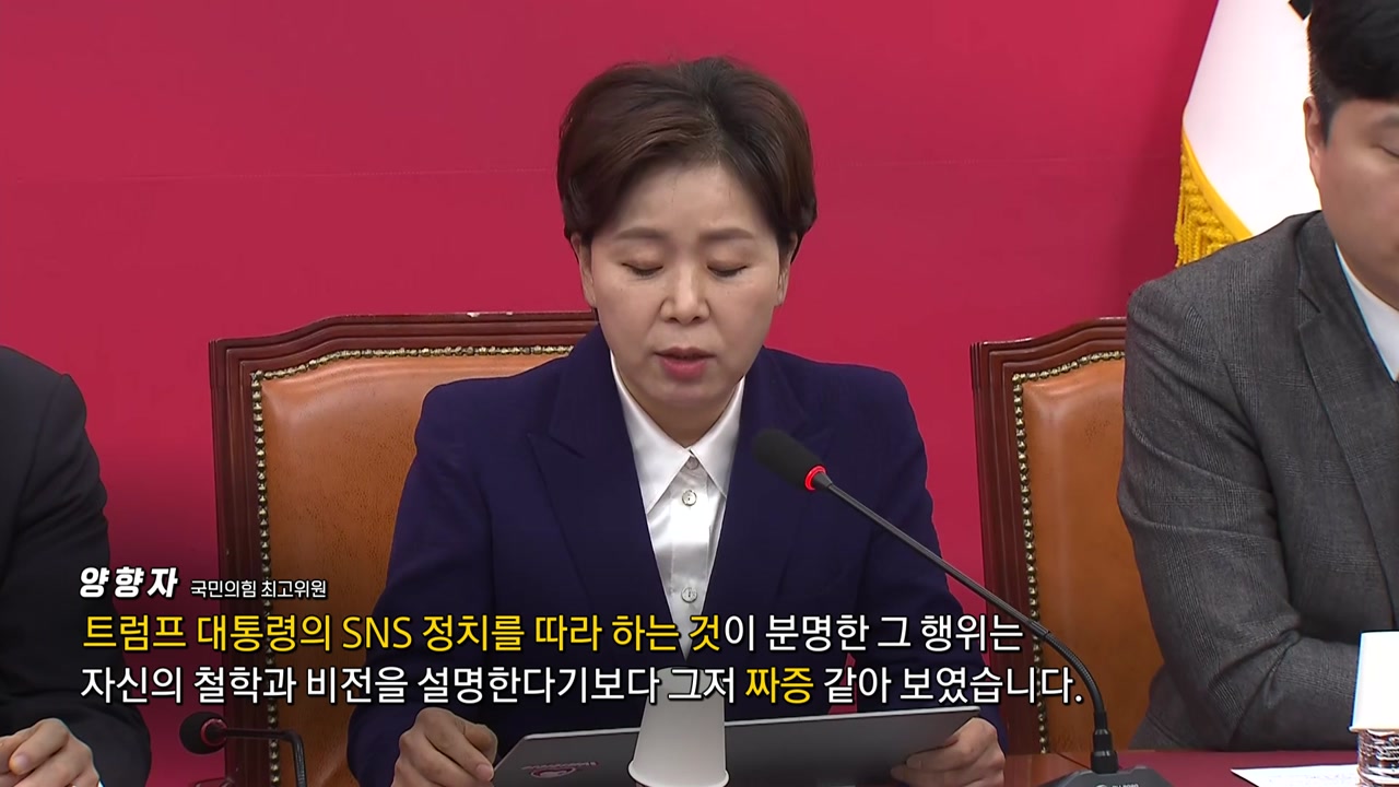 [양향자 / 국민의힘 최고위원 : 트럼프 대통령의 SNS 정치를 따라 하는 것이 분명한 그 행위는 자신의 철학과 비전을 설명한다기보다 그저 짜증 같아 보였습니다.]