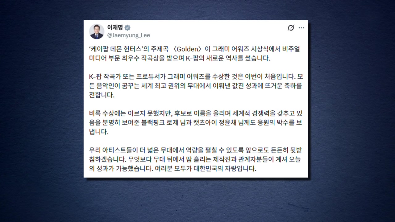 이재명 대통령은 ’케이팝 데몬 헌터스’의 주제곡 ’골든’이 그래미상을 받은 걸 두고, K-팝의 새로운 역사를 썼다며 세계 최고 권위의 무대에서 이뤄낸 값진 성과에 축하를 전한다고 밝혔습니다.