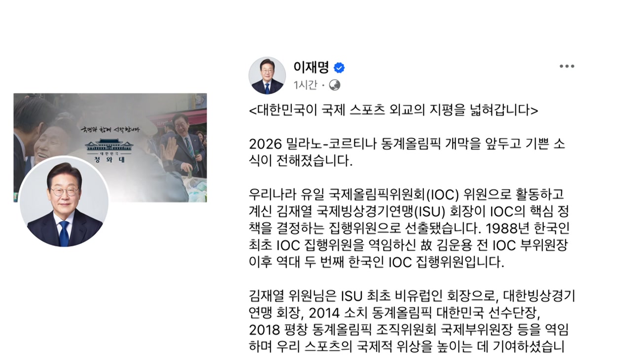 이 대통령은 어제(4일) SNS에, 김재열 위원은 1988년 한국인 최초 IOC 집행위원을 역임한 고 김운용 전 IOC 부위원장 이후 역대 두 번째 한국인 IOC 집행위원이라며 이같이 적었습니다.