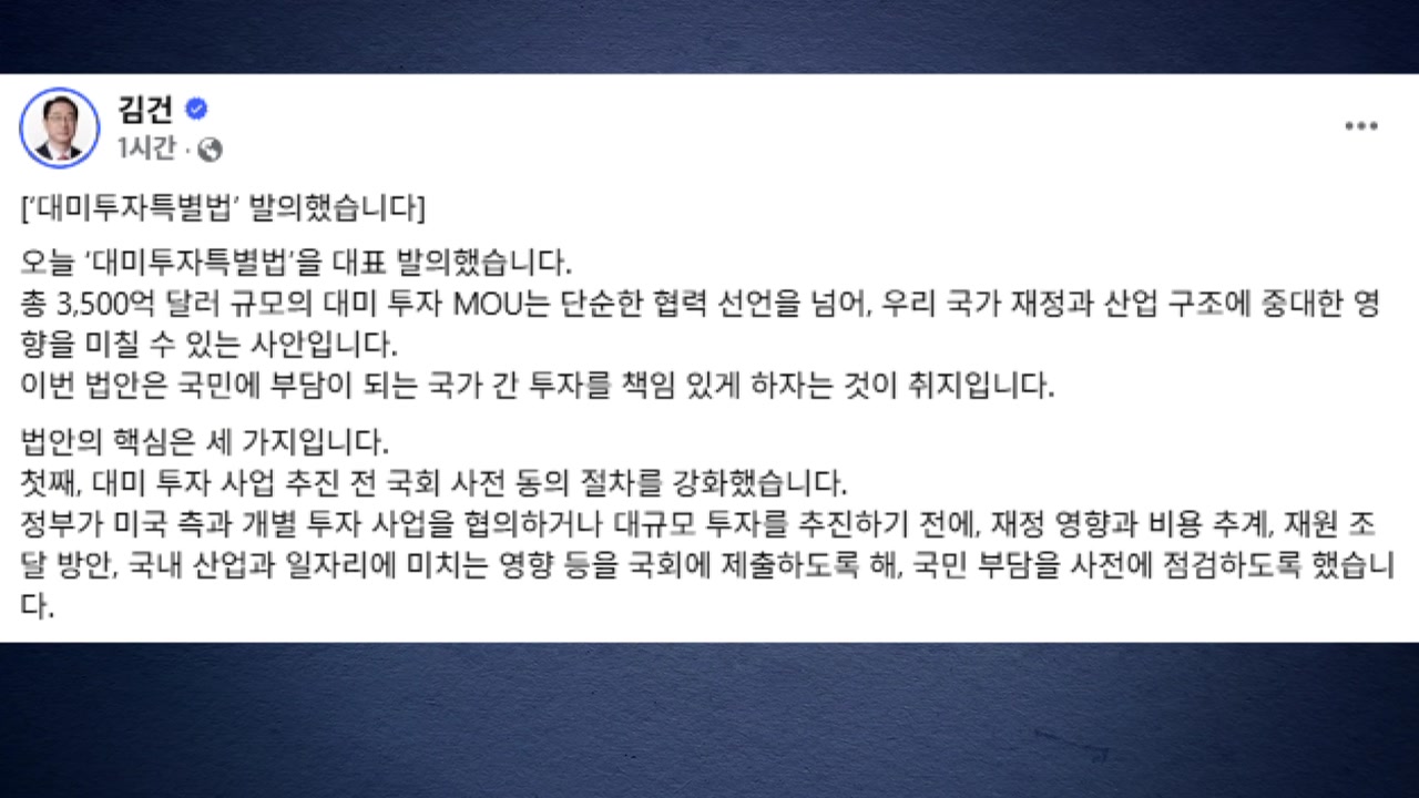 국회 외교통일위원회 소속 국민의힘 김건 의원은 한미 관세협상 관련 대미 투자 사업을 추진할 때 국회 동의 절차를 강화하는 내용의 특별법을 발의했습니다.