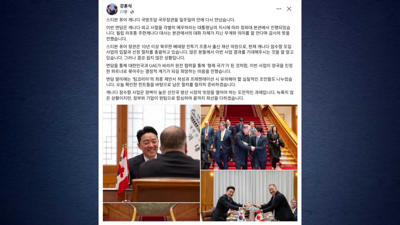 앞서 ’방산 특사’로 캐나다를 방문했던 강훈식 대통령비서실장이 방한한 캐나다 국방조달 국무장관을 만났습니다.