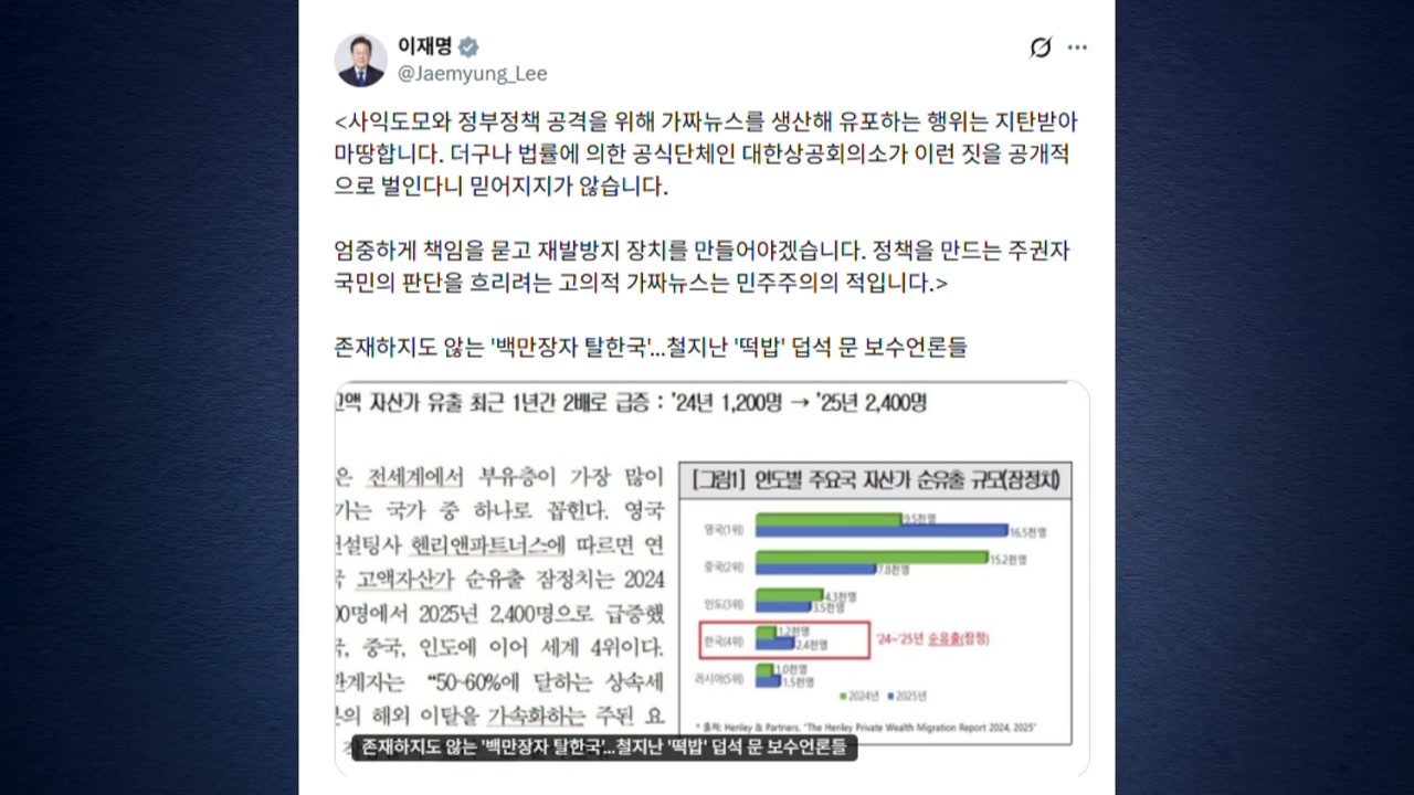"자산가 탈한국" 대한상의 자료에...이 대통령 "고의적 가짜뉴스"
