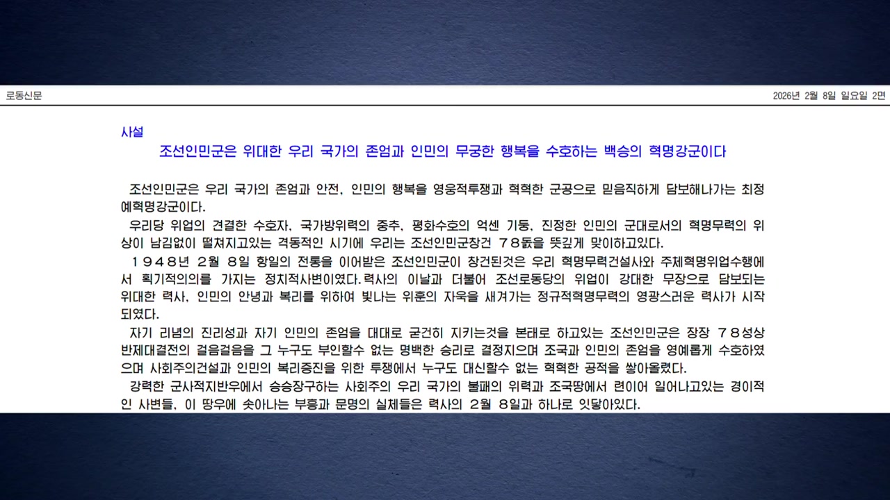 북한 노동당 기관지 노동신문은 오늘 인민군 창건 78주년 기념일인 건군절을 맞아 강대한 무장으로 국가의 부흥을 담보해야 한다고 강조했습니다.