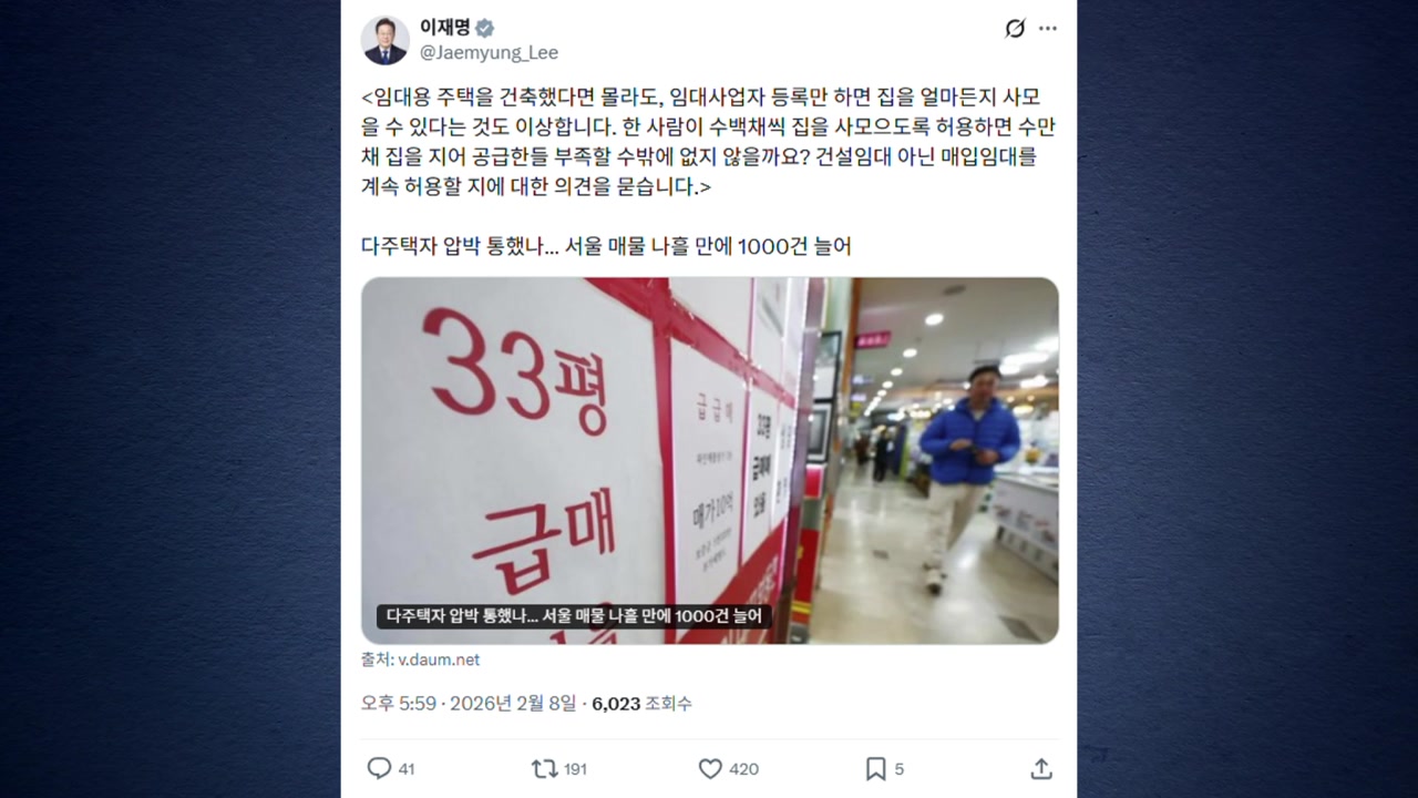다주택자를 향한 고강도 경고 메시지를 이어가는 이재명 대통령이, 건설 임대가 아닌 매입 임대를 계속 허용할지에 대한 국민 의견을 공개적으로 물었습니다.