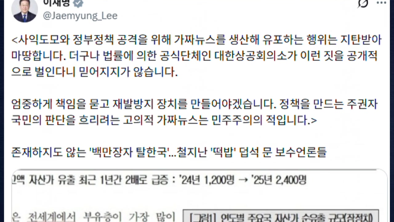 먼저 이재명 대통령이 SNS를 통해서 대한상공회의소를 비판했습니다. 그러니까 상속세로 자산가 2400명 탈한국, 한국을 벗어났다, 이런 대한상공회의소의 비판 내용들이 나오자 직격을 했고 또 덥썩 문 보수 언론까지 문제가 됐다 지적을 했는데 여기에 대해서 어떻게 보십니까?